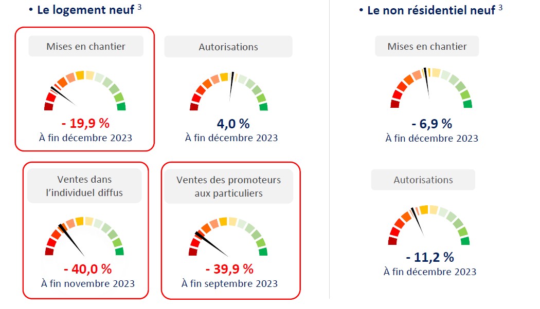 Au quatrième trimestre 2023, la chute de 19,9% sur un an des mises en chantier de logements s’avère toujours forte. Toutefois, les permis s’infléchissent à +4,0 %, mais cela tient à un pur effet base sur le collectif (le quatrième trimestre 2022 ressortait faible, après la forte hausse consécutive aux dépôts massifs de fin 2021, avant le passage à la RE2020). À l’amont de la filière, les ventes chutent de 40,4 % dans l’individuel diffus en glissement annuel sur trois mois à fin décembre et de 39,9 % entre les troisièmes trimestres 2022 et 2023 dans la promotion immobilière pour les ventes à particuliers. En revanche, sur des volumes bien moindres, celles destinées aux institutionnels progressent de 34,9 % grâce aux politiques de rachat du stock engagées par Action Logement et CDC Habitat.