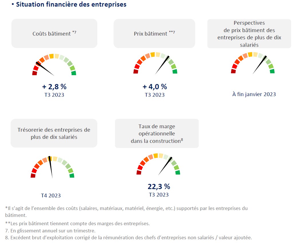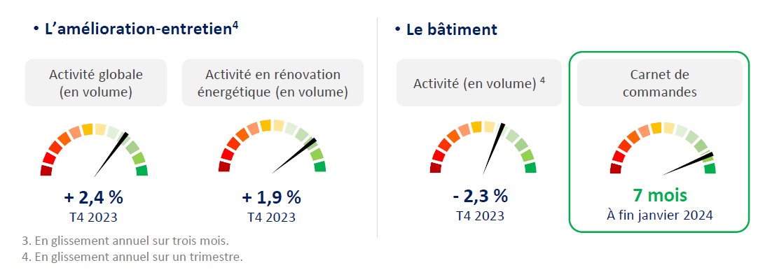 Globalement, le recul de la production bâtiment s’amplifie, à -2,3 % au quatrième trimestre 2023 sur un an. Elle bénéficiera toutefois dans les prochains mois de carnets de commandes encore à bon niveau, aux environs de 7 mois en moyenne à fin janvier 2024. Cela permettra d’éviter un décrochage brutal, mais pas l’entrée dans la crise en 2024.