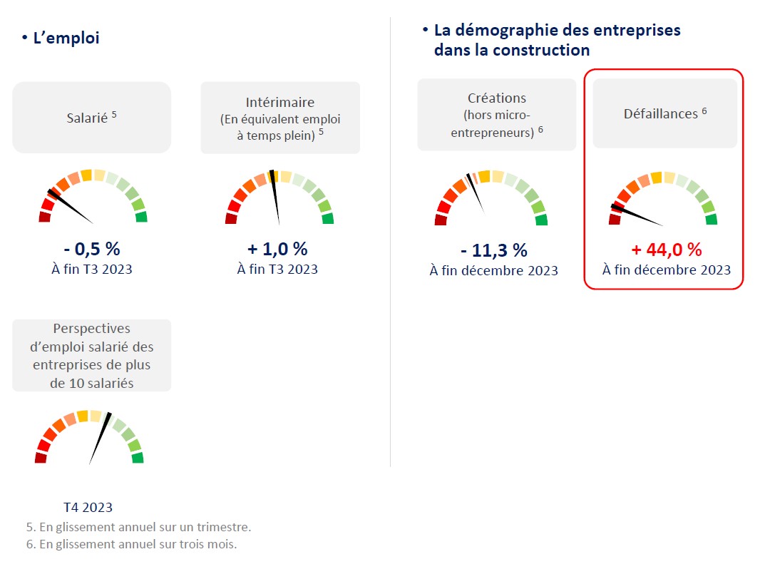 En outre, en glissement annuel au quatrième trimestre 2023, hors micro-entrepreneurs, les créations d’entreprises dans la construction reculent de 11,3 %. Quant aux défaillances, elles s’envolent à +44,0 % et dépassent leur niveau d'avant crise sanitaire, de 23,1 % précisément (quatrième trimestre 2019).