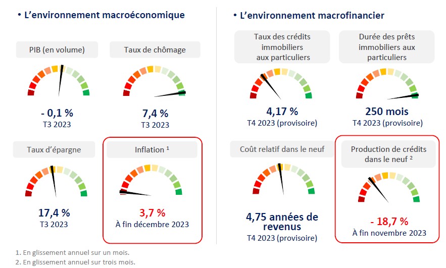 L’inflation reflue fin 2023, à 3,7 % en décembre sur un an. Les taux des crédits immobiliers aux particuliers poursuivent néanmoins leur remontée à 4,17 % en moyenne sur octobre et novembre 2023, hors frais et assurances. Enfin, la production de crédits immobiliers dans le neuf ralentit, à -18,7 % en glissement annuel sur trois mois à fin novembre 2023.