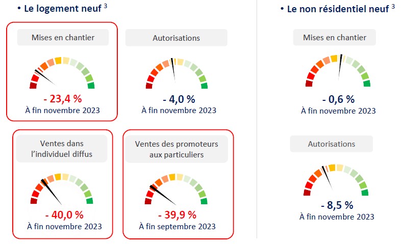 En glissement annuel sur trois mois à fin novembre 2023, la chute des mises en chantier de logements se poursuit pour se lire à -23,4 % alors que celle des permis ralentit brusquement à -4 %. Pour autant, l’activité à l’amont de la filière reste fortement dégradée : les ventes chutent de 40 % sur la même période dans l’individuel diffus et de 39,9 % entre les troisièmes trimestres 2022 et 2023 dans la promotion immobilière pour les ventes à particuliers. En revanche, sur des volumes bien moindres, celles destinées aux institutionnels progressent de 34,9 % grâce aux politiques de rachat du stock engagées par Action Logement et CDC Habitat.