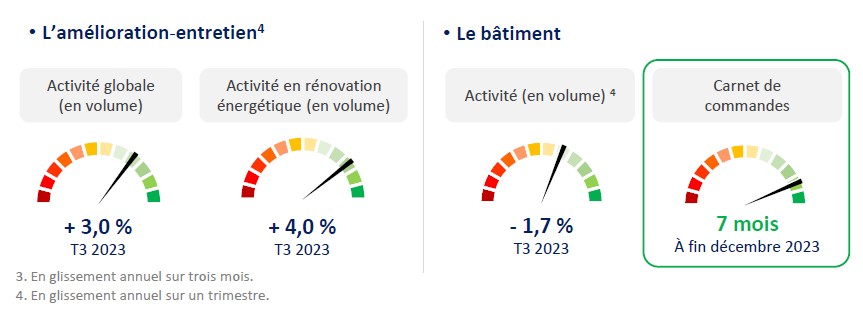 Quant à l’activité en amélioration-entretien, elle accélère à nouveau au troisième trimestre 2023, à +3,0 % en volume sur un an, après respectivement +2,4 % et +1,0 % aux deuxième et premier trimestres. Le mouvement s’avère encore plus rapide pour la rénovation énergétique, à +4,0 % entre les troisièmes trimestres 2022 et 2023.