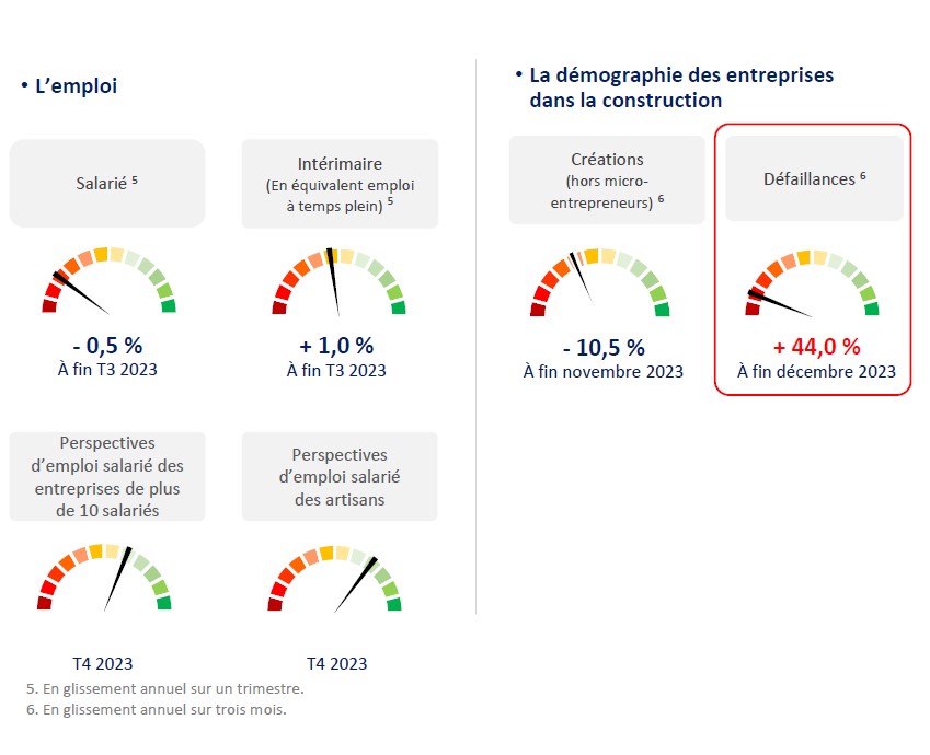 En glissement annuel sur trois mois à fin novembre 2023, hors micro-entrepreneurs, les créations d’entreprises dans la construction reculent de 10,5 %. Quant aux défaillances, en glissement annuel sur le quatrième trimestre, elles s’envolent à +44,0 % et dépassent leur niveau d'avant crise sanitaire, de 23,1 % précisément (quatrième trimestre 2019).