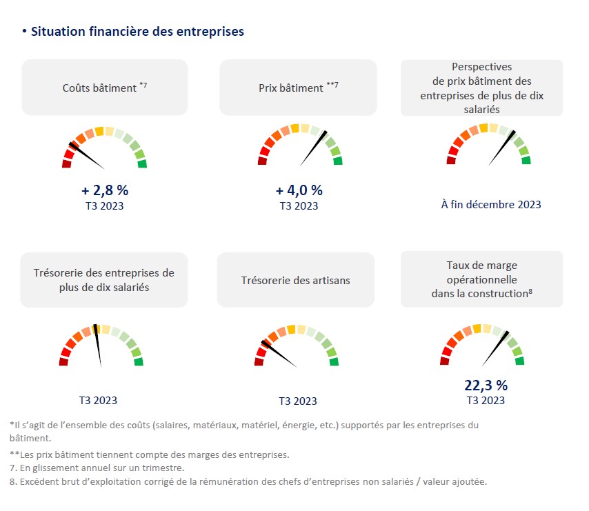 Par ailleurs, on relève une quasi-stabilisation du taux de marge opérationnelle (corrigé de la rémunération du travail des chefs d’entreprise non salariés) dans la construction au troisième trimestre 2023, à 22,3 %. Il se maintient clairement en-deçà de celui relevé au quatrième trimestre 2019 (26,7 %), avant le déclenchement de la crise sanitaire. En outre, toujours sur le troisième trimestre 2023, les trésoreries des artisans se dégradent, après trois trimestres d’assez bonne tenue, alors qu'elles s'érodent chez les entreprises de plus de dix salariés pour renouer avec leur moyenne de long terme.