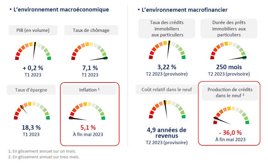 Au premier trimestre 2023, le PIB progresse légèrement (+0,2 % en volume), du fait de la bonne tenue du commerce extérieur. La demande intérieure souffre de la quasi-stabilisation des dépenses de consommation des ménages et du fléchissement de l’investissement. Quant au taux de chômage, il reste stable à 7,1 %, alors que le taux d'épargne des ménages se maintient globalement à niveau assez élevé (18,3 %). L’inflation ralentit à 5,1 % sur un an en mai 2023 après 6,0 % le mois précédent. Par ailleurs, les taux des crédits immobiliers aux particuliers poursuivent leur remontée à 3,22 % en moyenne sur avril et mai 2023, hors frais et assurances. En conséquence, la production de crédits immobiliers dans le neuf s'effondre de 36,0 % en glissement annuel sur trois mois à fin mai 2023.