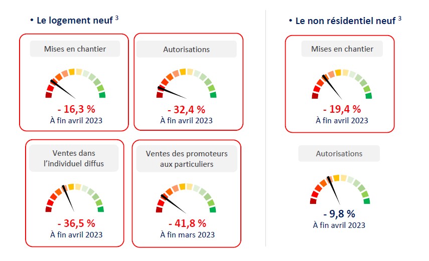 La crise du logement neuf s’intensifie encore. En glissement annuel sur trois mois à fin avril 2023, l’effondrement des permis se lit toujours au-delà de 30 % et la chute des mises en chantier s’accélère à -16,3 %. À l’amont de la filière, la descente aux enfers des ventes aux particuliers se poursuit, tant chez les constructeurs de maisons individuelles (-36,5 % en glissement annuel sur trois mois à fin avril 2023) que chez les promoteurs (-41,8 % entre les premiers trimestres 2022 et 2023). Quant aux ventes en bloc aux opérateurs HLM ou aux investisseurs institutionnels, leur chute est confirmée (-13,1 % sur cette dernière période).