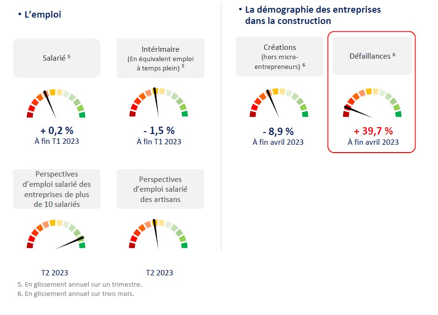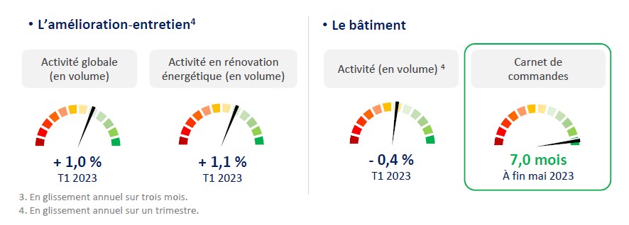 Au global, l’activité bâtiment s’érode de 0,4 % au premier trimestre 2023 sur un an. Elle bénéficiera toutefois encore dans les prochains mois de carnets de commandes à bon niveau, soit 7 mois à fin mai 2023.