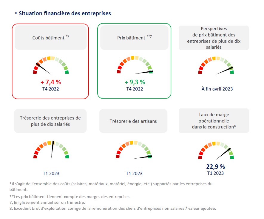 Au premier trimestre 2023, les trésoreries se redressent un peu du côté des structures de plus de dix salariés et plus franchement chez les artisans, mais l'on relève avant tout une grande instabilité pour ces derniers, qui traduit une certaine fragilité. Par ailleurs, le taux de marge opérationnelle dans la construction défalqué de la rémunération des chefs d'entreprise non salariés reste stable sur un trimestre à 22,9 %, donc très en-deçà des 27,0 % de l'année 2019.