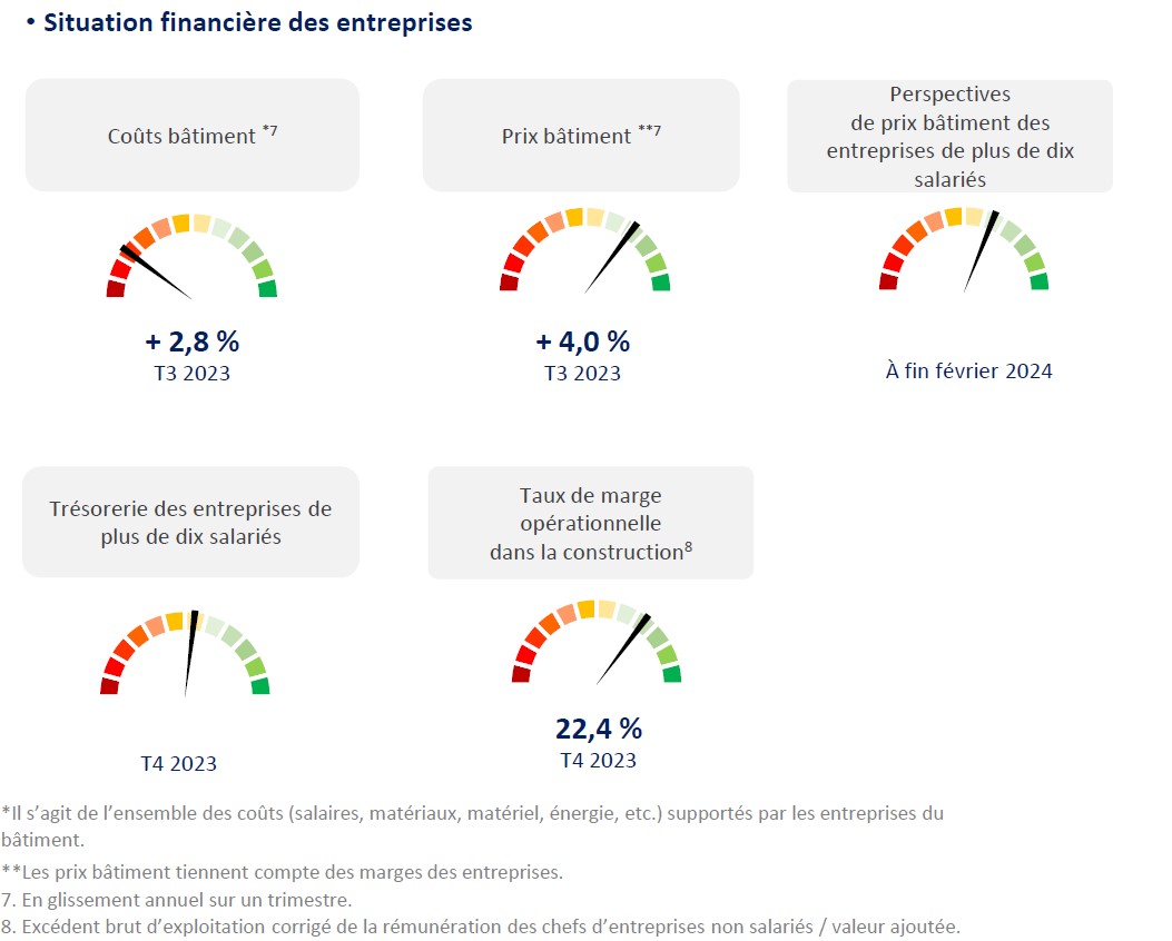 Globalement, le recul de la production bâtiment s’amplifie, à -2,6 % au quatrième trimestre 2023 sur un an. Elle bénéficiera toutefois dans les prochains mois de carnets de commandes encore à bon niveau, aux environs de 7 mois en moyenne à fin février 2024. Cela permettra d’éviter un décrochage brutal, mais pas l’entrée dans la crise en 2024.