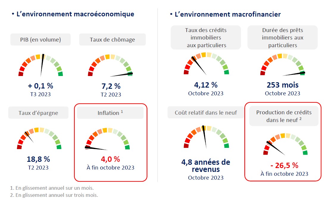 En octobre 2023, l’inflation ralentit à 4,0 % sur un an après 4,9 % le mois précédent, grâce principalement à la composante énergie. Par ailleurs, les taux des crédits immobiliers aux particuliers poursuivent leur remontée à 4,12 % en moyenne en octobre 2023, hors frais et assurances. En conséquence, la production de crédits immobiliers dans le neuf ralentit, à - 26,5 % en glissement annuel au troisième trimestre 2023.