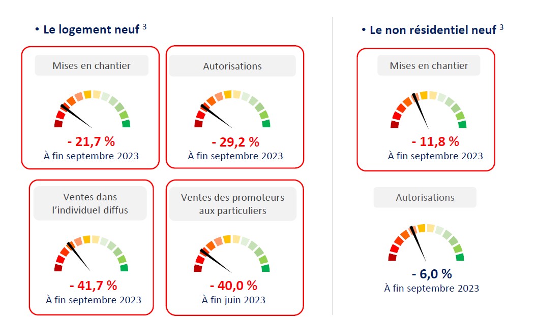 En glissement annuel au troisième trimestre 2023, la chute des mises en chantier de logements dépasse les 20 %, alors que les permis s’effondrent de près de 30 %. De plus, les perspectives restent très mauvaises avec des ventes en chute de 41,7 % dans l’individuel diffus entre les troisièmes trimestres 2022 et 2023 et de 30,0 % dans la promotion immobilière (y compris ventes aux institutionnels) entre les deuxièmes trimestres 2022 et 2023.
