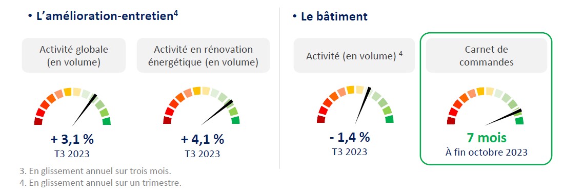 Globalement, l’activité bâtiment commence à se contracter, à -1,4 % au troisième trimestre 2023 sur un an, mais bénéficiera dans les prochains mois de carnets de commandes encore à bon niveau, aux environs de 7 mois en moyenne à fin octobre 2023 pour éviter le décrochage brutal. Ils s'érodent toutefois, annonçant une année 2024 clairement baissière.