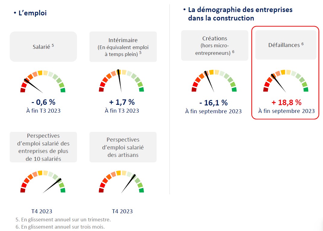 En glissement annuel au troisième trimestre 2023, hors micro-entrepreneurs, les créations d’entreprises dans la construction reculent de 16,1 %. Quant aux défaillances, sur la même période, elles augmentent de 18,8 % et commencent à dépasser leur niveau d'avant crise sanitaire, de 2,4 % précisément (cumul entre juillet et septembre 2019).
