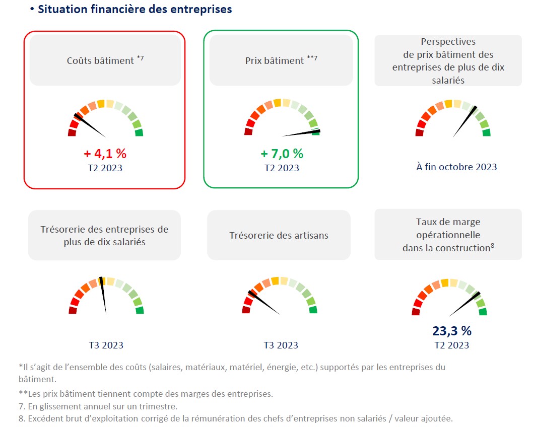 En glissement annuel sur le deuxième trimestre 2023, les prix bâtiment progressent de 7,0 % sur un an, alors que les coûts ralentissent à 4,1 %. Cette observation, qui doit beaucoup à l'instabilité des prix des matériaux depuis la fin 2020, se révèle cohérente avec l'augmentation du taux de marge opérationnelle (corrigé de la rémunération du travail des chefs d’entreprise non salariés) dans la construction, qui se relève de 2,5 points de pourcentage sur un an. Toutefois, à 23,3 %, il se maintient clairement en-deçà de celui relevé au quatrième trimestre 2019 (26,7 %), avant le déclenchement de la crise sanitaire. Plus récemment, au troisième trimestre 2023, les trésoreries des artisans se dégradent, après trois trimestres d’assez bonne tenue. Pour les entreprises de plus de dix salariés, elles s’érodent pour renouer avec leur moyenne de long terme.