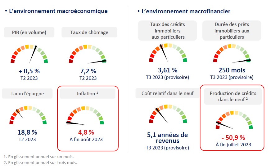Au deuxième trimestre 2023, le PIB en volume rebondit de 0,5 % grâce à la très bonne tenue du commerce extérieur. En revanche, la demande intérieure continue de souffrir : la consommation des ménages se contracte et l’investissement stagne. Le taux de chômage augmente de peu à 7,2 %, alors que le taux d'épargne des ménages progresse plus franchement pour se lire à niveau assez élevé (18,8 %). L’inflation accélère à nouveau et ressort à 4,8 % sur un an en août 2023 du fait de l'infléchissement des prix de l'énergie. Par ailleurs, les taux des crédits immobiliers aux particuliers poursuivent leur remontée à 3,61 % au troisième trimestre 2023, hors frais et assurances. En conséquence, la production de crédits immobiliers s'effondre, précisément de 50,9 % dans le dans le neuf en glissement annuel sur trois mois à fin juillet 2023.