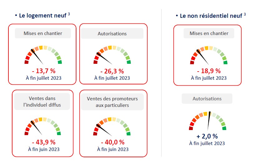 La crise du logement neuf s’accentue. En glissement annuel sur trois mois à fin juillet 2023, l’effondrement de plus de 25 % des permis se répercute sur les mises en chantier qui plongent de près de 15 %. Les perspectives restent très mauvaises, la chute des ventes entre les deuxièmes trimestres 2022 et 2023 s’établissant respectivement à 43,9 % et 30,0 % dans l’individuel diffus et la promotion immobilière (y compris ventes aux institutionnels).