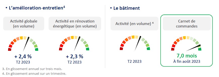 En termes de perspectives, l’activité bâtiment bénéficiera encore dans les prochains mois de carnets de commandes à bon niveau, aux environs de 7 mois en moyenne à fin août 2023.
