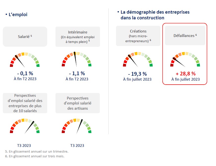 En glissement annuel sur trois mois à fin juillet 2023, hors micro-entrepreneurs, les créations d’entreprises dans la construction reculent de 19,3 %. Quant aux défaillances, sur la même période, elles s’envolent de 28,8 %, mais se maintiennent légèrement en-deçà de leur niveau d'avant crise sanitaire à -2,3 % (cumul entre mai et juillet 2019).
