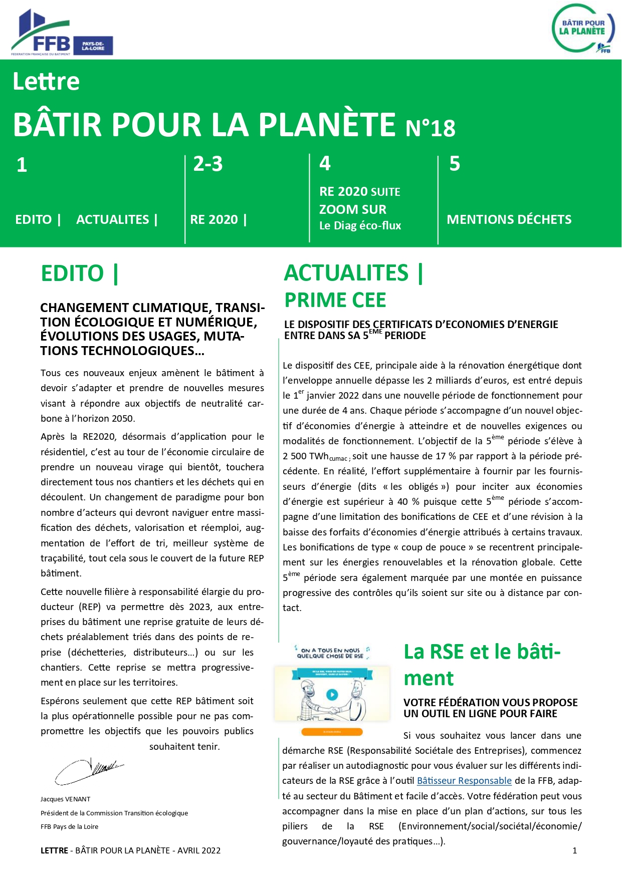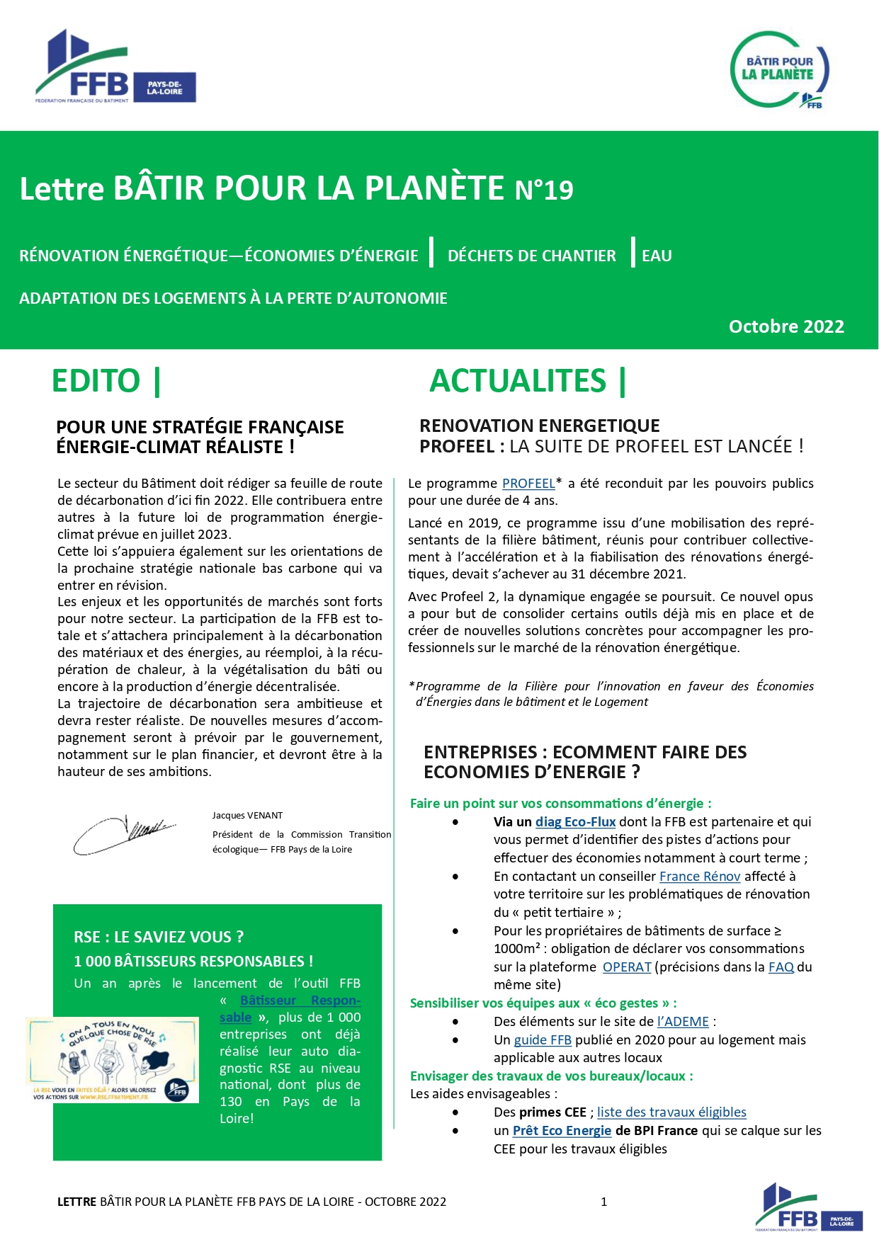 La FFB Pays de la Loire déploie des actions de sensibilisation dans les entreprises sur les thèmes de l’environnement, du développement durable, du traitement des déchets et de la maîtrise de l’énergie. Elle réalise des actions de conseil individuel pour les entreprises du bâtiment sur ce sujet.