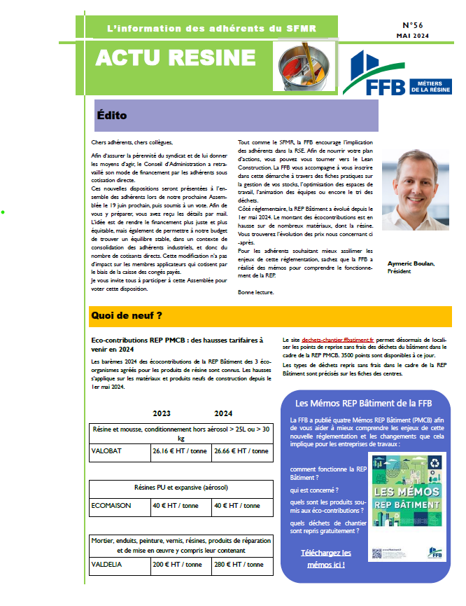 8:3731/07/2023ACTURESINE est la lettre trimestrielle envoyée aux adhérents du SFMR reprenant l'ensemble des actualités liées aux métiers de la résine.Contenu réservé aux adhérents FFB -