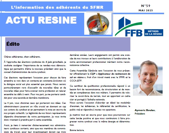 8:2202/06/2025ACTURESINE est la lettre trimestrielle envoyée aux adhérents du SFMR reprenant l'ensemble des actualités liées aux métiers de la résine.