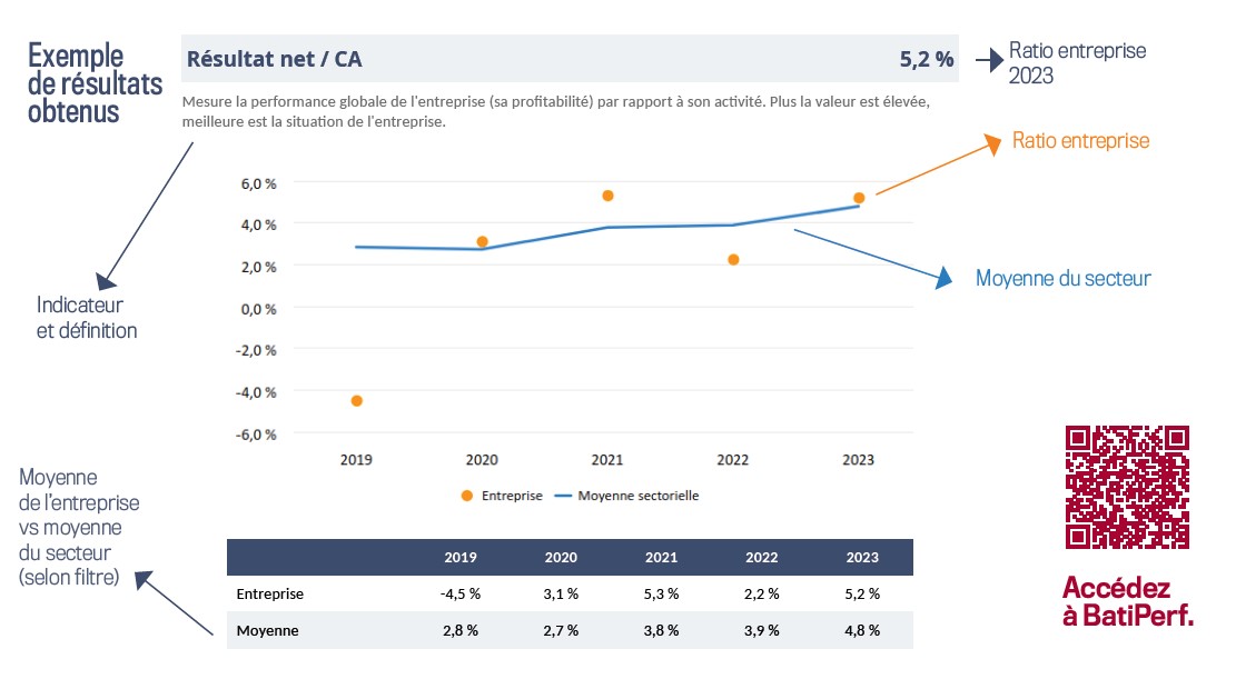Les graphiques de BatiPerf se présentent sous la forme d’une courbe bleue représentant la moyenne du secteur. Autour de cette courbe, des points orange indiquent le positionnement de l’entreprise sur différents ratios financiers. En un clin d’œil, on peut visualiser la performance de l’entreprise par rapport au secteur, avec la possibilité de remonter sur les cinq dernières années.