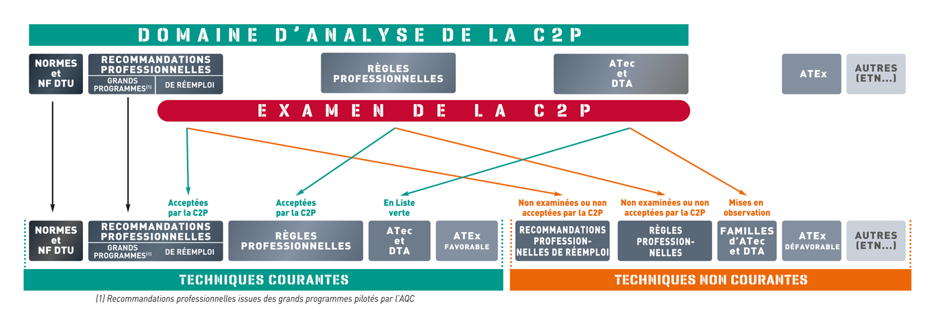 Les règles et recommandations professionnelles acceptées par la C2P (mis en œuvre par l’Agence Qualité Construction) et les procédés ou produits mis en observation par la C2P sont listés dans la publication semestrielle de la C2P et sont consultables sur le site de l’Agence Qualité Construction (www.qualiteconstruction.com).