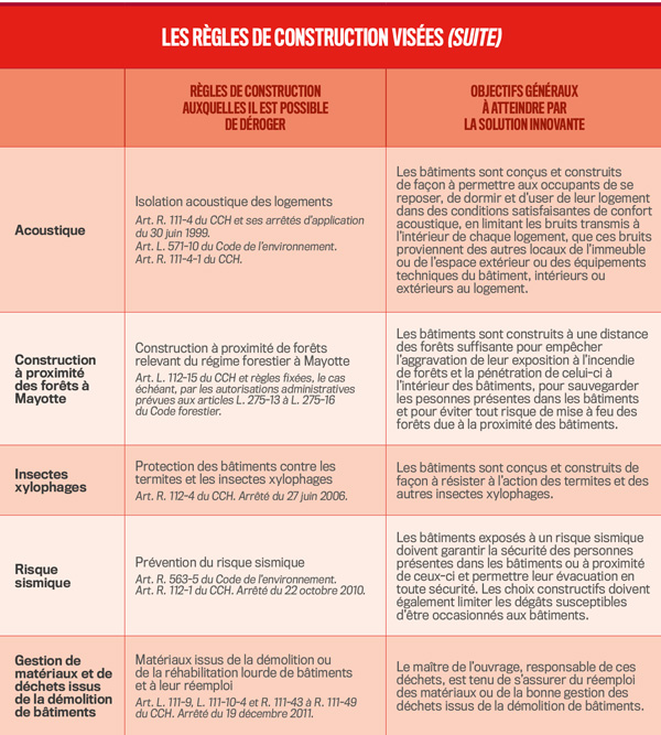 Si le maître de l'ouvrage souhaite déroger à une règle de construction, il doit soumettre son projet à un organisme compétent (CSTB, Cerema, contrôleur technique…) pour valider la solution innovante qu'il propose.