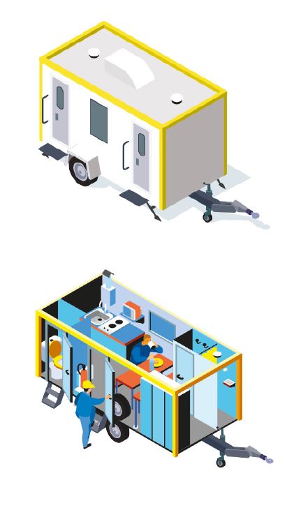 Conçu pour être déplacé de chantier en chantier et ne nécessitant pas de permis particulier pour sa conduite dès lors que son PTAC (poids total à charge) ne dépasse pas 3,5T, le véhicule aménagé comprend les installations nécessaires au confort des salariés (sanitaires indépendants, patères ou casier, point d’eau, restauration…).