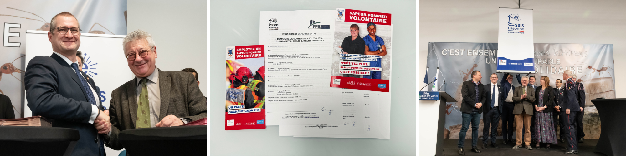 7:4107/05/2024Lors de la cérémonie des voeux 2024 de la FFB Essonne, son président, Fabien Daurat a signé une convention avec le Service Départemental d'Incendie et de Secours de l'Essonne pour soutenir le volontariat des sapeurs-pompiers dans les entreprises du bâtiment.![]()