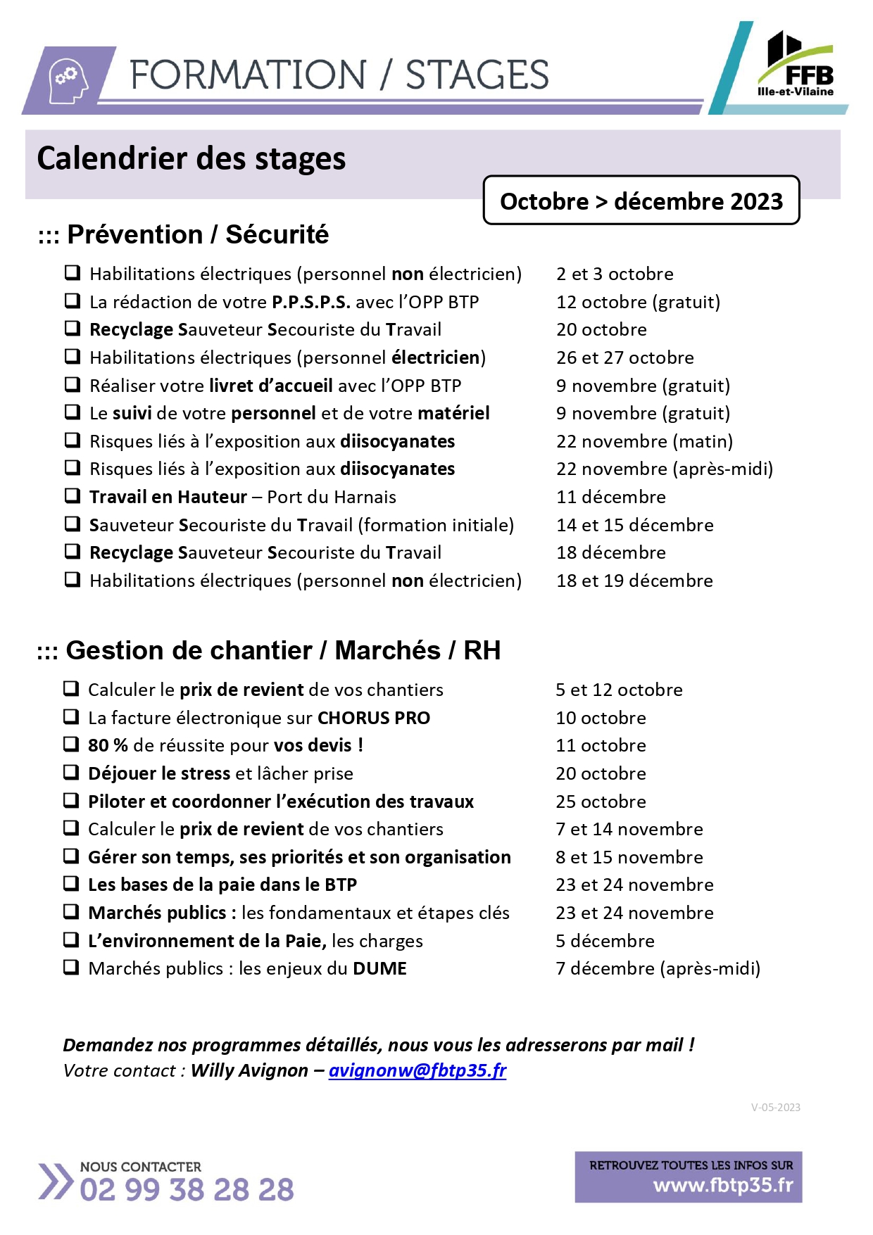 11:5623/10/2024La FFB 35 propose de nombreuses formations BTP à travers son organisme de formation BTP Compétences (prévention, sécurité, gestion de chantier, marchés, RH, techniques). Ces formations sont destinées aux dirigeants, artisans, ainsi qu'aux collaborateurs du Bâtiment. Votre contact : Willy Avignon.