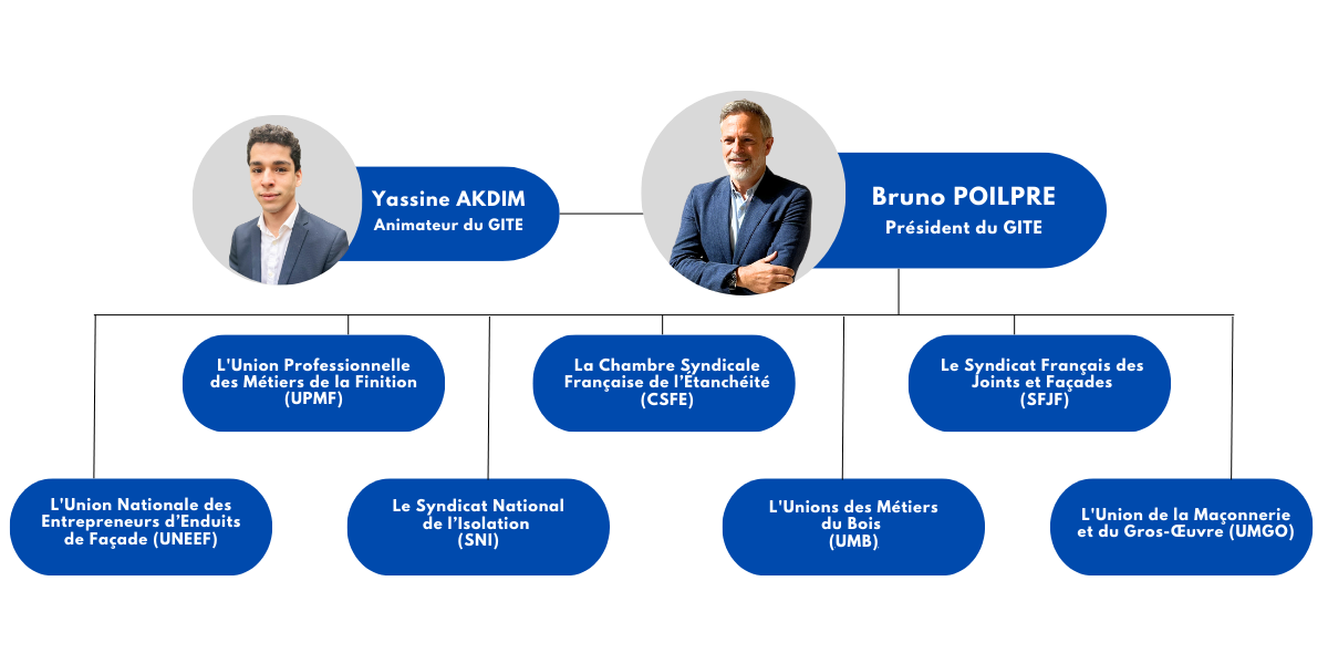 Afin de répondre à ces enjeux, la Fédération Française du Bâtiment (FFB) a créé en 2009 le Groupement Isolation Thermique par l’Extérieur (GITE-FFB). Il représente les métiers de l’ITE, à savoir : enduits minces, enduits épais, bardages, vêtures, vêtages.