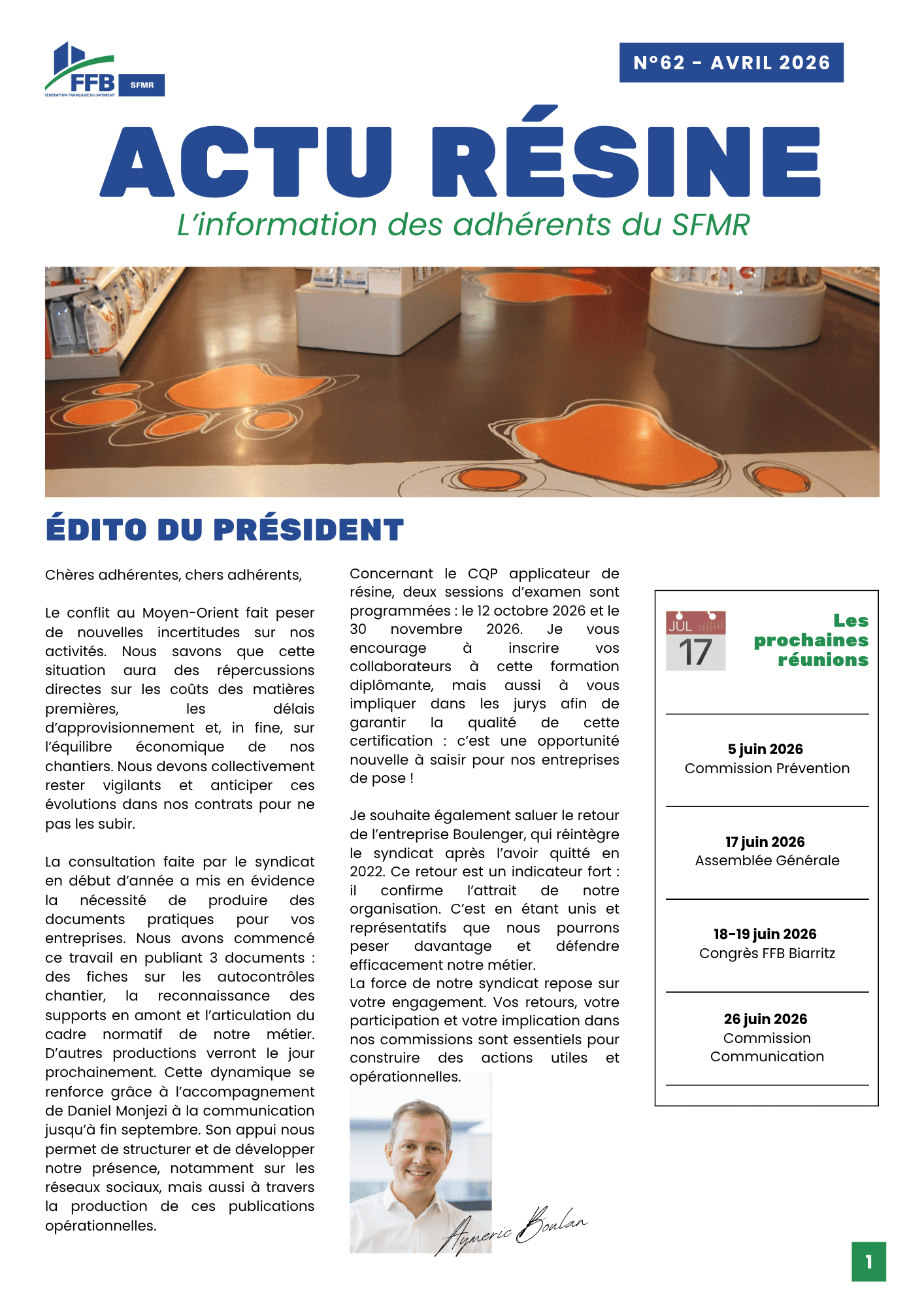 6:4417/04/2026ACTURESINE est la lettre trimestrielle envoyée aux adhérents du SFMR reprenant l’ensemble des actualités liées aux métiers de la résine.Contenu réservé aux adhérents FFB -
