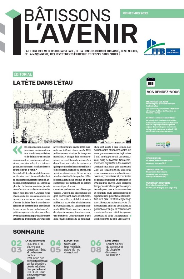 9:2924/06/2022Bâtissons l’Avenir est la lettre d’information trimestrielle du pôle Gros Œuvre de la FFB. Elle est éditée par L’Union de la Maçonnerie et du Gros Œuvre (UMGO-FFB), l’Union des Entrepreneurs d’Enduits de façade (UNEEF-FFB), l’Union Nationale des entrepreneurs carreleurs, chapistes et projeteurs de polyuréthane (UNECP-FFB), le Syndicat Français des Métiers de la Résine (SFMR-FFB) et l’Union Nationale des Entrepreneurs de Sols Industriels (UNESI-FFB).