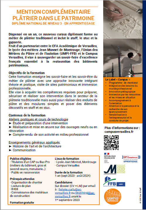 7:4402/03/2022Une nouvelle formation FCIL (Formation Complémentaire d’Initiative Locale) a été mise en place par l’UMPI (Union des métiers du plâtre et de l’isolation) et le Campus Versailles. Cette formation concerne les métiers traditionnels du plâtre tels que staff, gypserie….Retrouvez ci-dessous les informations concernant cette formation. -