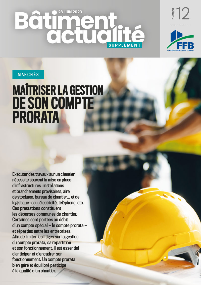 Dans ce supplément BA : exécuter des travaux sur un chantier nécessite souvent la mise en place d’infrastructures : installations et branchements provisoires, aire de stockage, bureau de chantier… et de logistique : eau, électricité, téléphone, etc. Ces prestations constituent les dépenses communes de chantier. Certaines sont portées au débit d’un compte spécial — le compte prorata — et réparties entre les entreprises. Afin de limiter les litiges sur la gestion du compte prorata, sa répartition et son fonctionnement, il est essentiel d’anticiper et d’encadrer son fonctionnement. Un compte prorata bien géré et équilibré participe à la qualité d’un chantier.