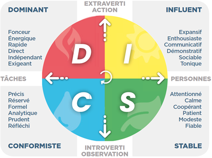 Le dominant est en haut à gauche du disque. Cela veut dire qu'il est plutôt extraverti et orienté vers les tâches.