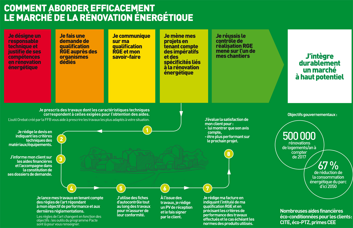 De leur côté, les artisans et les entreprises, accompagnés par la FFB, ont engagé d'importants efforts pour se former et se qualifier afin d'aborder le marché de la rénovation énergétique dans les meilleures conditions, en apportant à leurs futurs clients la preuve de leurs compétences et en bénéficiant de l'éco-conditionnalité des aides. Le nombre d'entreprises qualifiées RGE dépasse aujourd'hui les 60 000  : partout en France, un particulier qui se lance dans un projet de rénovation énergétique peut désormais trouver sur son territoire une entreprise locale qualifiée dans la ou les catégories de travaux concernées - depuis le remplacement de fenêtres, de systèmes de chauffage et d'eau chaude, l'installation de pompe à chaleur ou de panneaux photovoltaïques jusqu'aux projets complets de rénovation, en passant par la ventilation, l'isolation des murs et planchers bas ou du toit. Pour aider leurs futurs clients à formaliser leur projet, simuler les travaux envisagés et les économies d'énergie attendues, les professionnels ont à leur disposition des outils simples et efficaces comme le logiciel Orebat, qui facilite leur rôle de conseil.