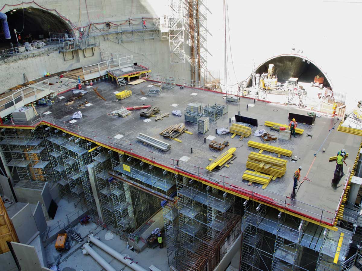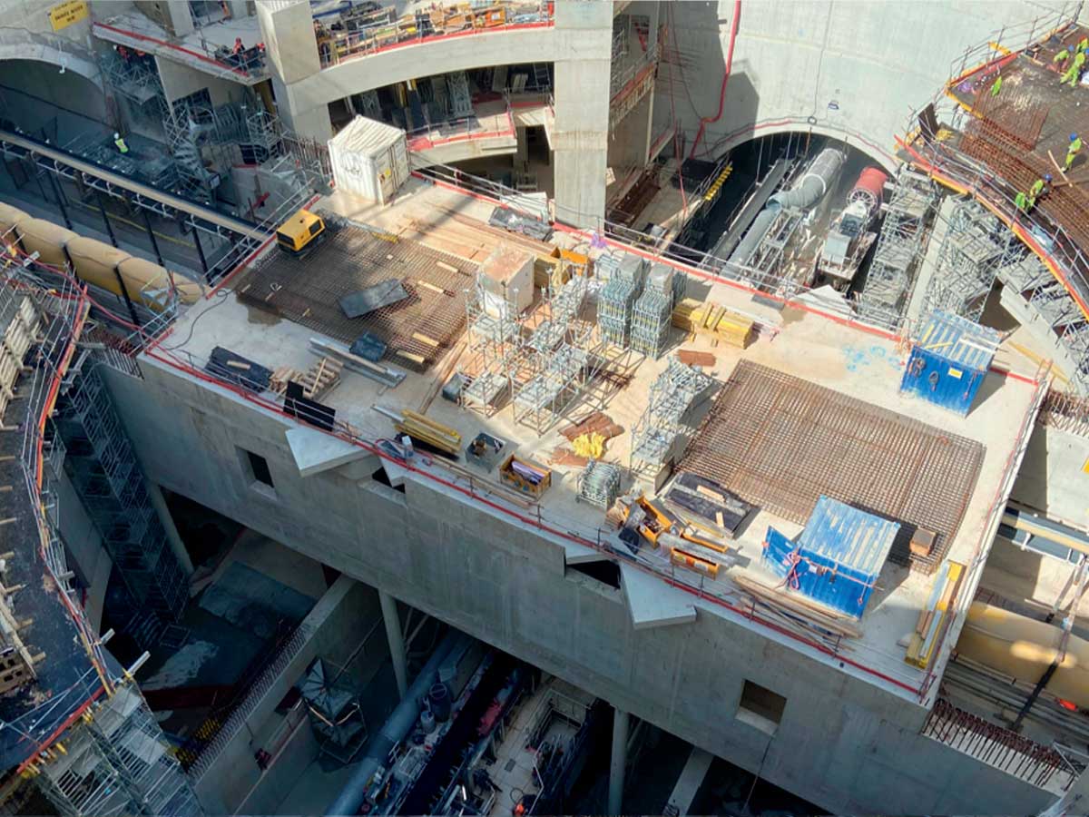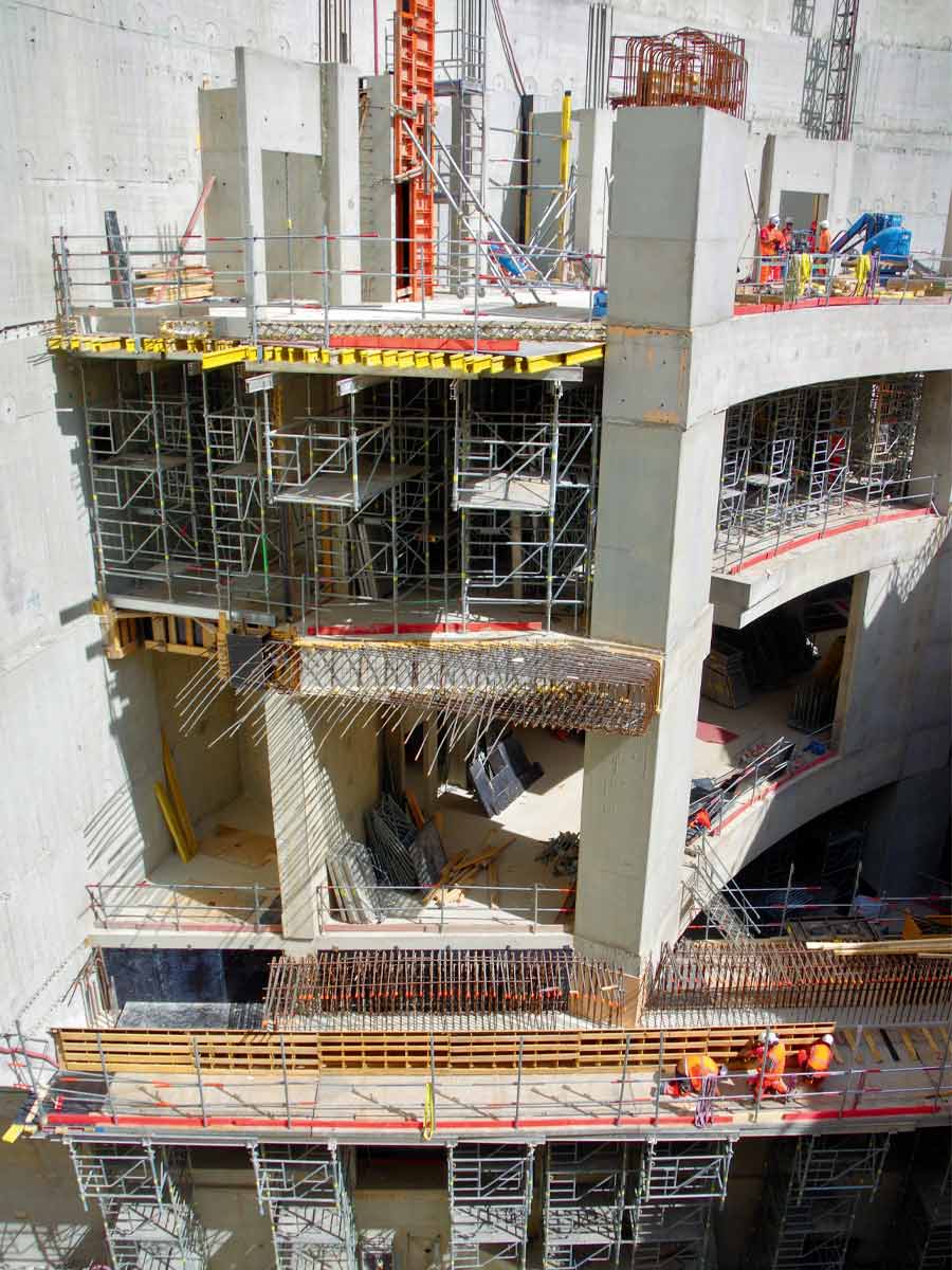Pour Mills, l’installation des étaiements est réalisée au moyen d’un outil 3D, avec une précision de l’ordre de 5 millimètres réglée au laser, et avec des circulations qui garantissent la sécurité des compagnons. « Depuis le niveau – 9, qui compte plus de 10 mètres sous plafond, nous étayons successivement chaque dalle en prenant appui sur la précédente, ajoute David Grandclaude, avec des systèmes de porte-à-faux pour pouvoir coffrer les nez de dalles face au noyau central. » Une énergie considérable, qui nécessite la rotation de 800 tonnes de matériel d’étaiement et 35 compagnons, dont il ne restera rien après le chantier, mais indispensables à l’élévation de l’ouvrage jusqu’à la surface.