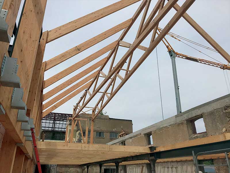 de poutres en bois lamellé-collé douglas et épicéa et recouverts d’un
