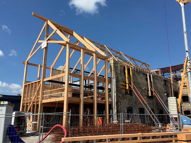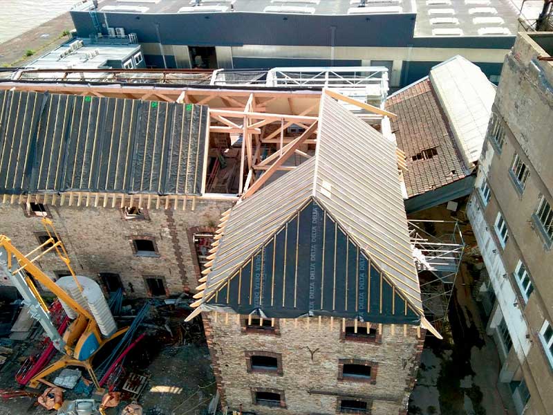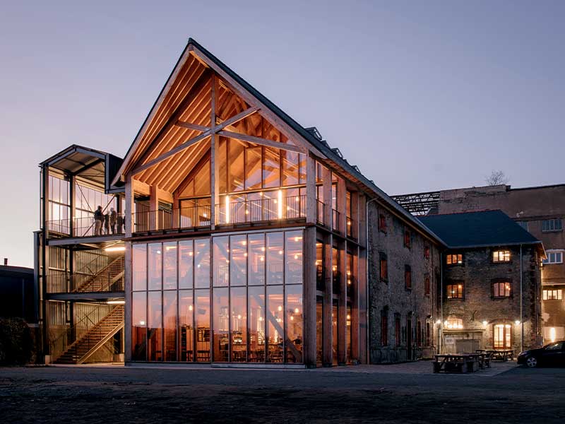 À l’issue de dix-huit mois de travaux, cette ancienne savonnerie en R+2 à la façade classée a été transformée en un complexe accueillant une brasserie artisanale, un restaurant, un bar et une salle événementielle pro- longée par une terrasse panoramique. « Le projet de l’architecte Christophe Theilmann s’appuie sur une approche multimatériau, le seul moyen de conserver au maximum les structures en bois existantes », déclare Florian Lefèvre, directeur général de Godard Construction Bois, l’entreprise titulaire du lot charpente bois, qui emploie 28 salariés à Héric, en périphérie nantaise. « Une expertise multiple qui convient parfaitement à notre groupe », ajoute-t-il. L’entreprise fait partie du groupe Lefèvre Développement, qui compte aussi Cruard Charpente (Simplé, Mayenne), Fast Métal (fabricant de ferrures et charpentes métalliques) et Bichot Menuiserie (restauration de menuiseries de monuments anciens), toutes deux implantées à Château-Gontier-sur-Mayenne.