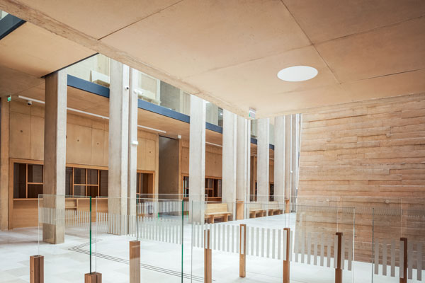 Autre solution issue d’un dialogue technique : pour réaliser la salle des pas perdus – un grand espace vide situé au milieu du bâtiment, qui s’étend sur un double niveau surplombé par une double verrière – l’entreprise a fait préfabriquer vingt-six poteaux en béton armé ocre de 10 m de hauteur, de la même couleur que les voiles des mégablocs. « Le coulage en place de ces ouvrages n’aurait pas présenté toutes les garanties de sécurité pour nos compagnons, ajoute Guillaume Faure. Pour les mettre en œuvre, nous avons conçu un outil spécifique qui permet leur retournement à la verticale sans risque, mis au point par l’équipe chantier principalement pour ce projet. »