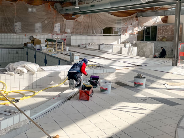 Également spécialiste de l’étanchéité liquide, le carreleur souligne : « Les compagnons qui sont intervenus ont été formés et agréés par le fabricant du procédé d’étanchéité liquide qui est sous Avis technique. Nos qualifications Qualibat 3372 et 3232 certifient notre savoir-faire pour les travaux d’étanchéité liquide et d’étanchéité des bassins de piscine. Ces éléments sont indispensables pour être assuré en technique courante par les garanties de la décennale. » Pour le jointoiement, l’entreprise SRS s’est affranchie de l’utilisation d’époxy, à la résistance éprouvée en milieu humide, afin de préserver la santé de ses compagnons – « même avec le port d’EPI, respirer l’époxy peut créer des allergies, indique Fabrice Fouquet – mais aussi pour ne pas altérer le carrelage de teinte claire : l’époxy tache, graisse et reste très difficile à nettoyer ». L’entreprise a donc jeté son dévolu sur un joint silicaté, intégré dans l’Avis technique du procédé d’étanchéité liquide du fabricant qui a été choisi pour réaliser cette piscine collective.