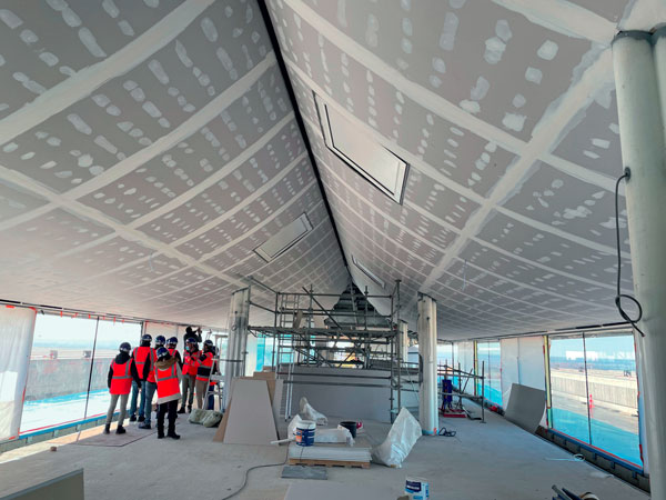 En plus d’un rendu esthétique irréprochable, le plafond devait aussi répondre à des performances d’absorption acoustique, puisque trois des quatre parois du bâtiment sont entièrement vitrées, dans le but d’offrir aux visiteurs une vue panoramique sur les coteaux de Saint-Émilion depuis le domaine situé en surplomb. Pour répondre à cette exigence, les plaques de plâtre de 6 mm ont été recouvertes de panneaux en laine minérale, eux-mêmes striés et cintrés, puis recouverts d’un enduit à base de billes de verre agglomérées, avec une structure poreuse, l’ensemble de ce complexe garantissant les performances acoustiques attendues, de façon parfaitement invisible.
