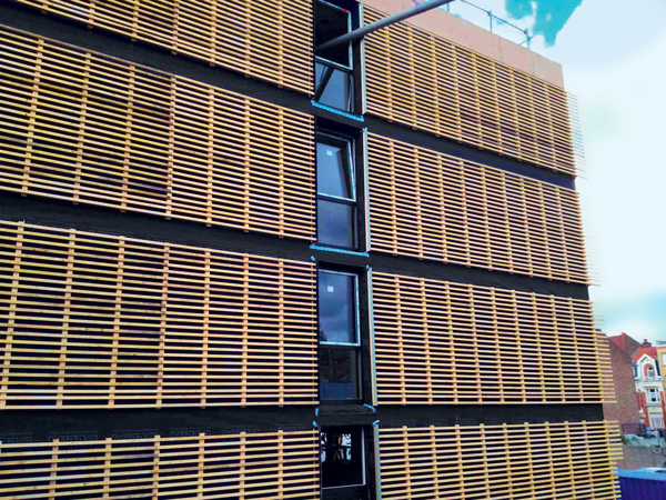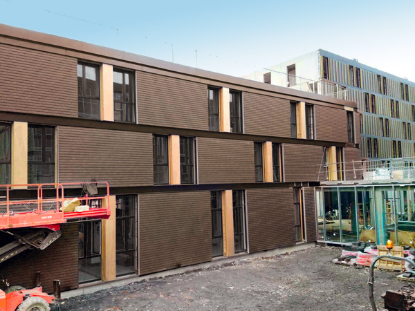 Post Architectes manifeste également un grand intérêt pour les savoir-faire des artisans, ce qui a sans doute pesé dans le choix de réaliser des façades en bardage de tuiles de terre cuite, confiées à l’entreprise arrageoise SAS Sergeant, implantée à Gavrelle (Pas-de-Calais). Sur les grandes façades des bâtiments, réalisées en ossature bois et livrées avec le pare-pluie, ses équipes ont mis en œuvre un lattage horizontal ; sur les pignons en béton, elles ont réalisé l’ensemble du complexe avec une isolation en laine de verre, une ossature primaire en chevrons, suivies d’un pare-pluie et d’un lattage complet. L’ensemble des façades a ensuite été recouvert de tuiles de teinte bleu fumé, avec un pureau de 100 mm, et des séparations horizontales au niveau des planchers grâce à la pose d’une poutre en U en acier galvanisé et post-laqué. « Toute la difficulté de cet ouvrage a consisté à bien régler les aplombs verticaux sur l’ossature primaire, pour obtenir un alignement et des raccords parfaits au niveau des tuiles d’angle et des poutres, explique Adrien Humez, le conducteur de travaux chargé du chantier. Un ensemble qui donne au projet son esthétique industrielle. »