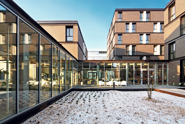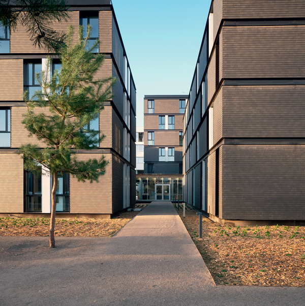 – composée de trois associés, Jean-Philip Lebecq, Yoann Devynck et Vincent Lagache – qui défend une architecture « contextuelle, sobre et néanmoins expressive ». Un ensemble de partis pris qui s’exprime notamment dans le subtil calepinage des façades sombres, recouvertes d’un bardage en tuiles de terre cuite, rythmé horizontalement par des poutres décoratives en métal, et verticalement par des capots métalliques en acier qui recouvrent les trumeaux des fenêtres et répondent aux profilés métalliques des rez-de-chaussée vitrés. La décomposition volumétrique en plusieurs bâtiments plutôt qu’en un seul procède du désir de les fondre dans le paysage, grâce à la végétalisation, et de traiter le cœur d’îlot à la manière d’un parc boisé.