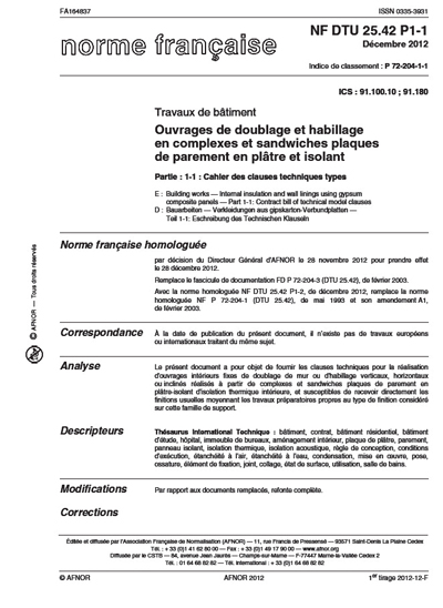 9:3621/03/2023Le NF DTU 25.42 « Ouvrages de doublage et habillage en complexes et sandwiches plaques de parement en plâtre et isolant » donne les spécifications de mise en œuvre d’ouvrages intérieurs fixes de doublage de mur ou d’habillage verticaux, horizontaux et inclinés.