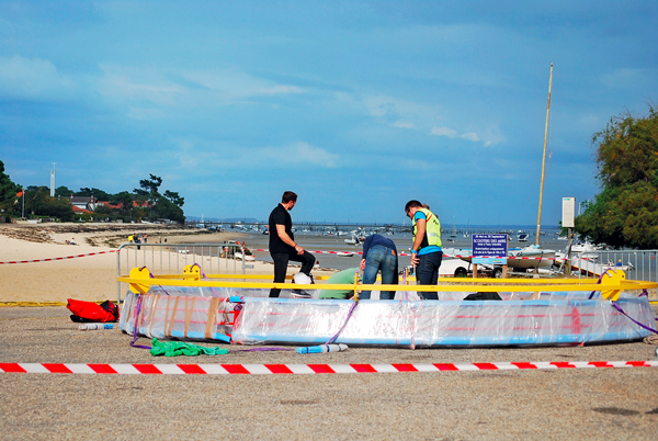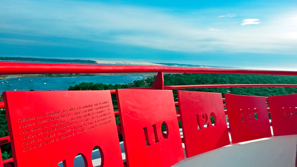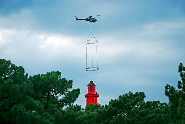 Tout en restant parfaitement conforme au design de l’ouvrage existant, le nouveau garde-corps a été adapté aux attentes actuelles : « Plutôt qu’un acier classique, nous avons proposé de le réaliser en inox 316, hautement résistant au brouillard salin et présentant les mêmes sections, ajoute le chef d’entreprise. D’un aspect visuel identique, le nouveau garde-corps sera plus durable, et repoussera le prochain remplacement à l’échelle d’un siècle. » Reste que l’opération d’héliportage, peu fréquente dans le métier de la serrurerie, a exigé des procédures hors du commun. Ainsi, un périmètre de sécurité a été établi, avec l’évacuation des maisons dans un rayon de 300 m, pendant la durée de l’opération. D’autre part, en concertation avec la société d’héliportage et la sous-préfecture d’Arcachon, Sur Mesure Métallique a fabriqué un écarteur en métal, qui a servi à suspendre le garde-corps en empêchant les sangles de venir frotter sur la lanterne, tout en maintenant pendant la mise en œuvre une distance de sécurité entre la lanterne et les compagnons. Autre nouveauté, le garde-corps supporte désormais des plaques en aluminium gravé qui informent les visiteurs du site sur le paysage, pour profiter pleinement de la vue splendide sur le bassin d’Arcachon.