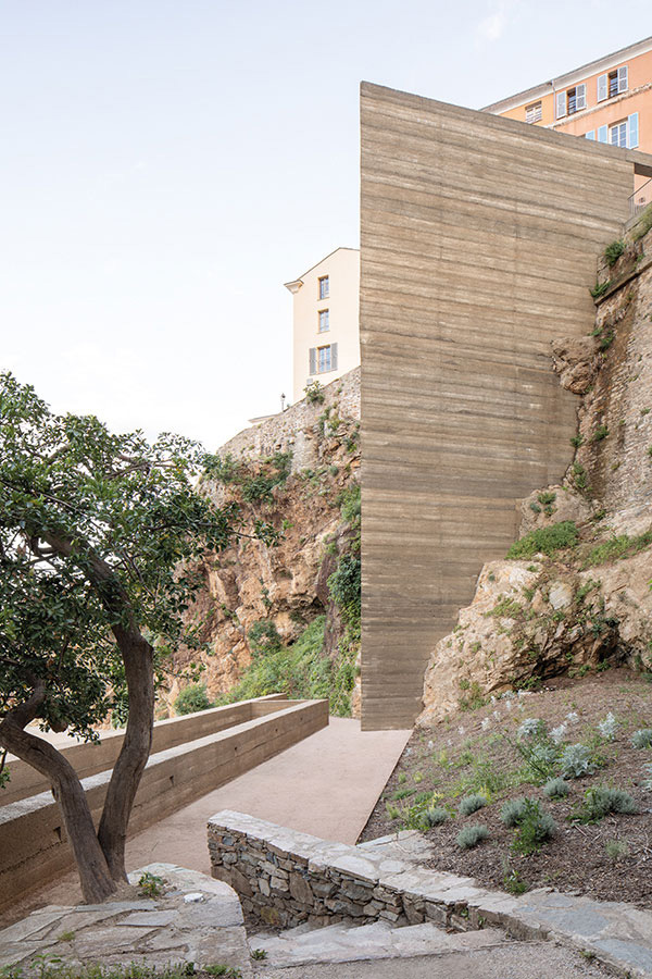 Bien qu’ils aient été livrés en 2020, les ouvrages en béton de ce projet, qui relie la citadelle et le port de la cité corse, s’harmonisent parfaitement avec la façade ocre de l’ancien bastion et son soubassement en pierre ainsi qu’avec les rochers qui descendent en aplomb jusqu’à la mer. L’objectif de la ville de Bastia de reconquérir cet espace à forte déclivité, pour en faire une liaison douce qui associe escaliers, théâtre de verdure, belvédères et plateformes – sans oublier un ascenseur destiné aux personnes à mobilité réduite – pour cheminer jusqu’au jardin Romieu en bordure du port, restauré lui aussi, est donc parfaitement atteint. Mais, au-delà de la fonctionnalité, la maîtrise d’œuvre, composée du mandataire Buzzo Spinelli, avec les Ateliers Gama pour le paysage et, pour responsable du patrimoine, Antoine Dufour, a signé un projet fortement ancré dans son territoire, qui repose sur l’utilisation d’un béton de site dit « sec » lui donnant sa typicité unique.