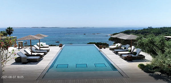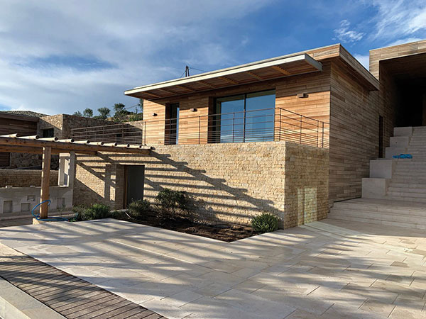 Même particulièrement bien préparé, ce chantier a eu tout de même son lot de contraintes. « La Covid a eu des conséquences sur nos interventions. Bien que les chiffrages aient commencé fin 2019, le démarrage des travaux de pose n’a eu lieu qu’en 2021. Face à la rareté de certains matériaux, les approvisionnements ont été un peu complexes avec des difficultés, dès la fabrication, engendrées par les impacts de la crise sanitaire, concède Anthony Frizot. En outre, contrairement aux idées reçues, en Corse, parfois, il peut pleuvoir à grandes eaux, et l’île est soumise au vent. Pour la pose des carreaux – du 40 × 80 cm imitation pierre – dans la piscine en béton banché, une fois l’étanchéité liquide appliquée par le maçon, il a fallu attendre de meilleures conditions climatiques pour réaliser la pose en double encollage. » Sous les effets du vent et du soleil, la colle aurait pris trop rapidement, ce qui aurait entraîné un défaut d’adhérence. Par ailleurs, « toutes les entreprises ont réalisé un important travail d’altimétrie entre les sols intérieurs, les terrasses en pierre, en bois, et pour respecter la hauteur des margelles de piscine ; mais aussi entre le niveau inférieur de la maison et le bassin, ou encore par rapport aux revêtements de sol et à la climatisation : toutes les grilles de ventilation sont en partie basse des cloisons, détaille Anthony Frizot. En coordination avec les autres corps d’état, nous avons réalisé un véritable travail de sur-mesure. Nous avons la chance de travailler en interface avec des équipes de professionnels, structurées et très performantes. » Et le résultat est à la hauteur de ce projet d’exception.